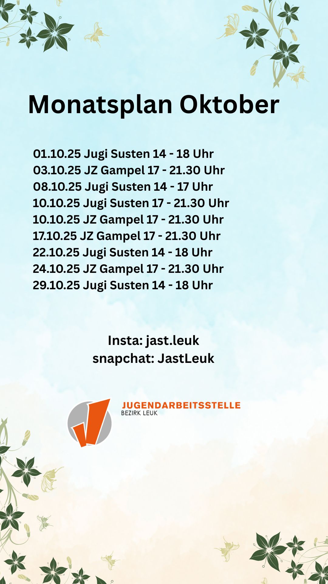 Monatsprogramm Oktober der Jugendarbeitsstelle Bezirk Leuk.